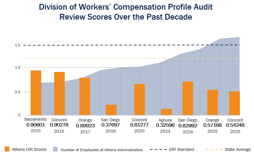 The most recent audits are especially telling. In a period when several TPAs did not meet DWC expectations, Athens delivered multiple strong results across different offices, including three separate scores in 2024 and 2025 under 0.60, and one as low as 0.32596.